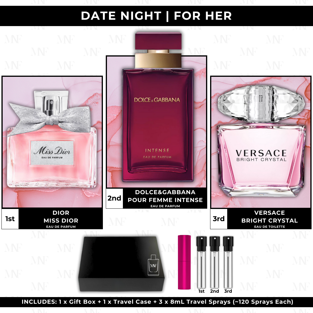 The Date Night Gift Box Set For Her is a captivating trio of fragrances curated to enhance your charm and elegance for any romantic evening. Dior Miss Dior EDP exudes timeless sophistication with its delicate blend of fresh florals and soft musk, perfect for making a graceful and alluring impression. Dolce & Gabbana Pour Femme Intense adds a seductive touch with its rich, creamy notes of marshmallow and orange blossom, evoking passion and warmth. Completing the set, Versace Bright Crystal offers a radiant, playful burst of fruity florals, adding a sparkling and youthful energy. Together, these scents provide the perfect balance of romance, elegance, and allure, making this set a must-have for unforgettable date nights.