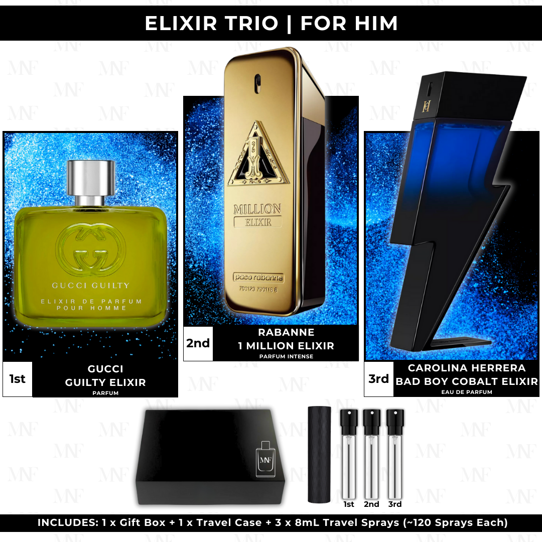 Gucci | Guilty Elixir Pour Homme | Parfum | 8mL Travel SprayRabanne | 1 Million Elixir | Parfum Intense | 8mL Travel SprayCarolina Herrera | Bad Boy Cobalt Elixir | Eau de Parfum | 8mL Travel Spray8mL Travel CasePremium Gift Box