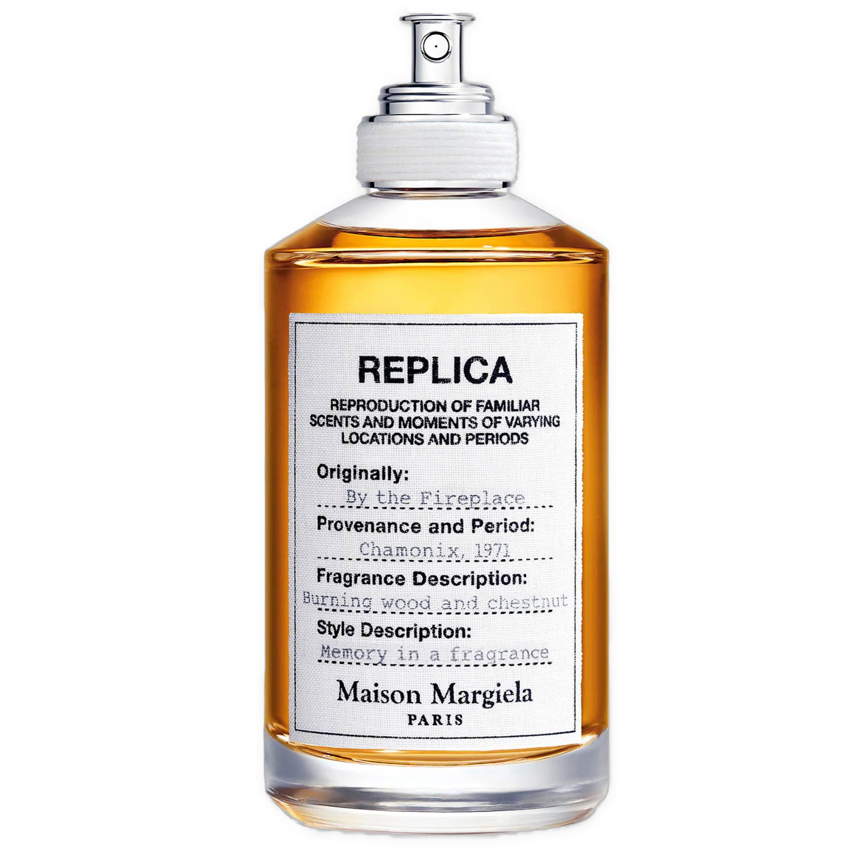 Description: Replica By the Fireplace" by Maison Martin Margiela is a warm, woody fragrance that was launched in 2015. It's a unisex scent designed by Marie Salamagne. The fragrance opens with top notes of cloves, pink pepper, and orange blossom, offering a spicy and slightly floral introduction. The middle notes feature chestnut, guaiac wood, and juniper, adding a rich and earthy heart to the scent. The base notes of vanilla, Peru balsam, and cashmeran provide a warm, sweet finish, creating a cozy and comforting feel. This unique blend of ingredients captures the essence of a relaxing evening by a crackling fireplace